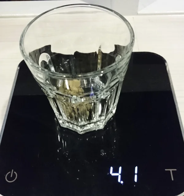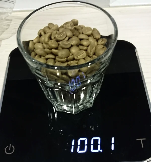 這次的烘焙量500g, 先取100g樣品估算瑕疵比率. 生豆含水量飽滿, 質地結實, 顏色是新鮮的藍綠色. 瑕疵豆大約4g, 大多是碎豆, 羊蹄, 以及一些發育不良未成熟的種子. 沒有全黑, 異物跟發霉. 據生豆商的通知, 本批由於是小量分裝出貨, 故有先挑掉一些包裝時看到的瑕疵豆.