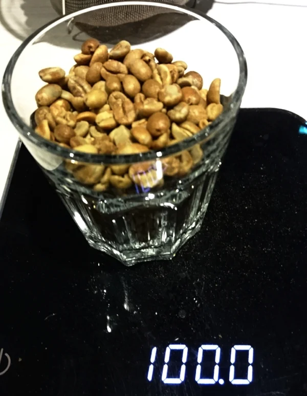 這次的烘焙量500g, 先取100g樣品估算瑕疵比率. 打開包裝, 強烈的酒香撲鼻, 不輸一些知名莊園的日曬品項. 瑕疵豆大約5g, 大多是碎豆. 一些酸豆, 過度發酵的重大瑕疵並沒有在樣品內找到, 只有一些果皮碎屑.