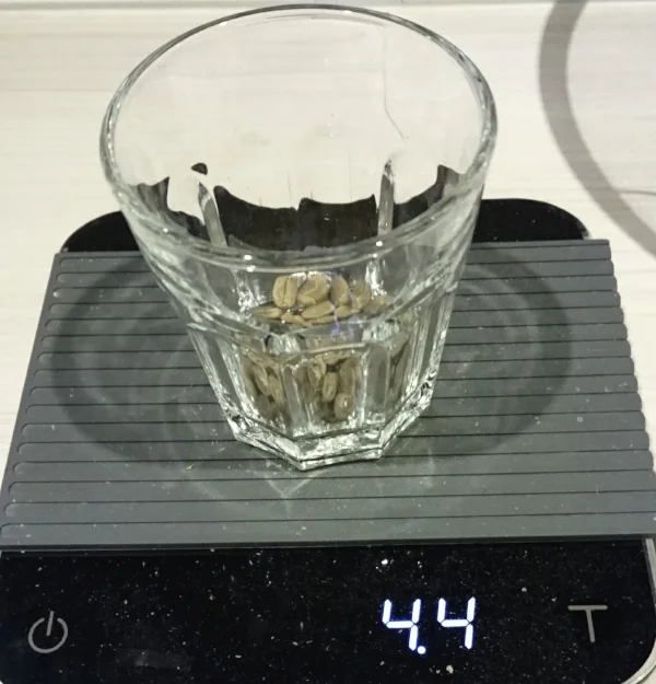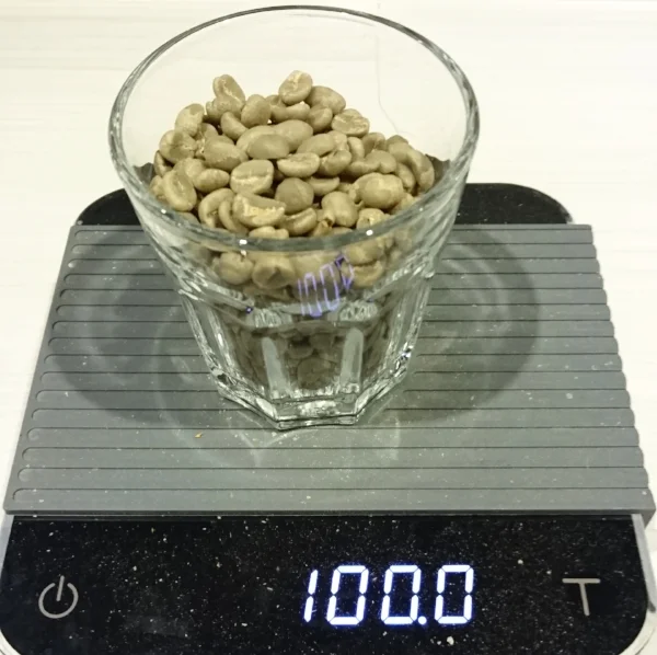 這次的烘焙量1000g, 先取100g樣品估算瑕疵比率. 含水量高, 生豆翠綠, 顆粒大小也很平均. 挑出瑕疵豆4.4g, 大多是貝殼, 或是形狀怪異的豆子, SL28跟SL34非常常見這種現象. 挑完全部剩941g就準備開烘了.