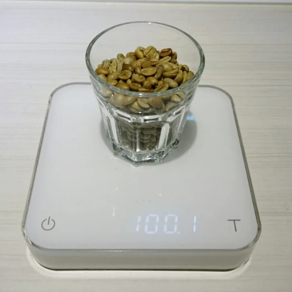 這次的烘焙量500g, 先取100g樣品估算瑕疵比率. 含水量高, 生豆翠綠, 顆粒大小也很平均. 挑出瑕疵豆2.3g, 大多是蒂頭部份碎裂的豆子, 或是去除羊皮層時輾斷的, 僅少數過度發酵. 挑完全部剩約491.7g.