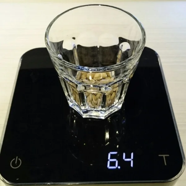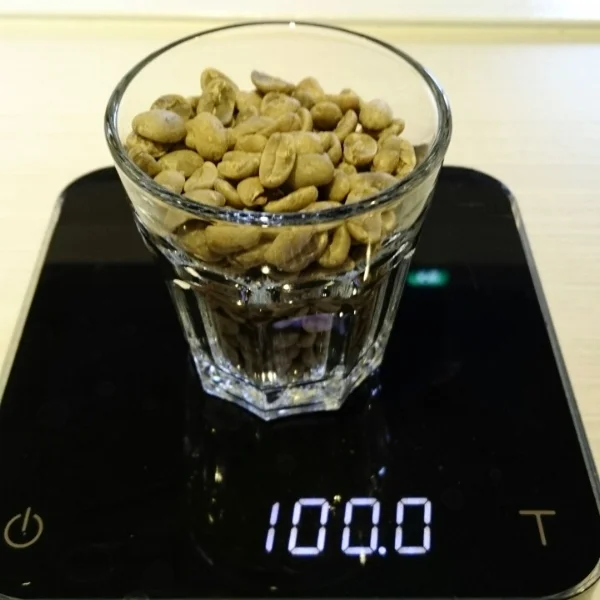這次的烘焙量500g, 先取100g樣品估算瑕疵比率. 挑出瑕疵豆6.4g, 似乎稍多了一點, 大致上出現的瑕疵不外乎是脫水, 破碎豆, 還有局部黑豆. 豆子的size也比支前烘過的一些Pacamara來得小一些. 含水量感覺不算太高, 密度似乎也不高. 挑完剩473.2g.
