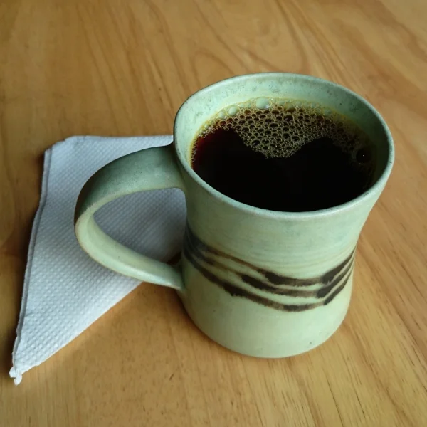 出杯用的杯子感覺是手工製的陶杯, 雖不細緻但是卻相當有趣. 這杯Malabar帶著李子果乾一般的樸實香氣, 阿薩姆紅茶一般的質感, 溫和的水果酸, 帶點黑巧克力, 煙燻風味, 又帶有堅果油脂的滑順感. 尾韻有點類似蔗糖的些許甜味. 感覺烘焙度應該是#60, 一爆結束左右. 烘焙品質相當不錯.