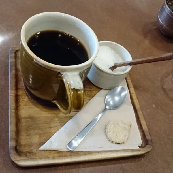 出杯是用上了釉的手工陶杯, 看似是手工燒製的. 還附上了一小盅的砂糖跟一片小餅乾. 濕香聞到了一些煙燻, 以及黑色乾燥水果的味道. 還略帶一些烘焙味. 入口味道相當強烈, 但是仍舊可以感覺到一些類似薑茶的氣息, 質感類似鮮奶油般的濃稠, 甜度跟酸度都不高, 尾韻持續了那股薑味. 看來我跟店家對中焙的看法並不一致, 而店家的烘焙也比較傳統, 比較保守一點, 或許是新開的店, 還沒完全掌握好Probaton 12的特性吧?