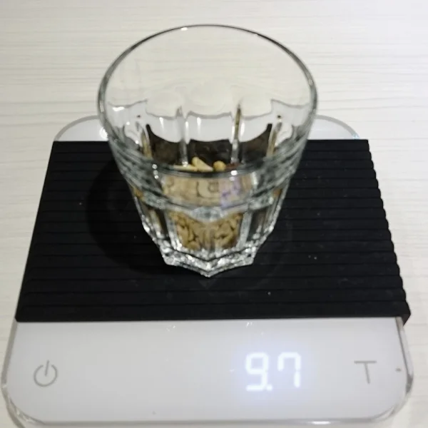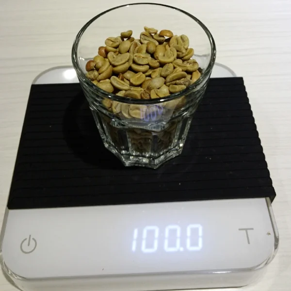 這次的烘焙量500g, 先取100g樣品估算瑕疵比率. 一倒出來就看到了豆商送我的大禮: 一顆完整的果實. 剔除果實, 挑出瑕疵豆9.7g, 不少的果皮碎片, 碎豆, 過度發酵, 發酵不均勻的狀況明顯. 挑完全部剩約448.5g.
