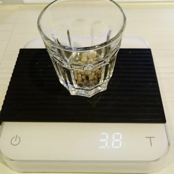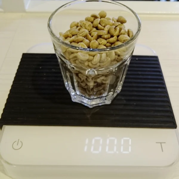 這次的烘焙量500g, 先取100g樣品估算瑕疵比率. 一如大部分的肯亞, 有不少的貝殼豆, 還有一些形狀不完全的豆子. 挑出瑕疵豆3.8g, 豆子看起來還呈黃綠色, 水分看似保持得還不錯.