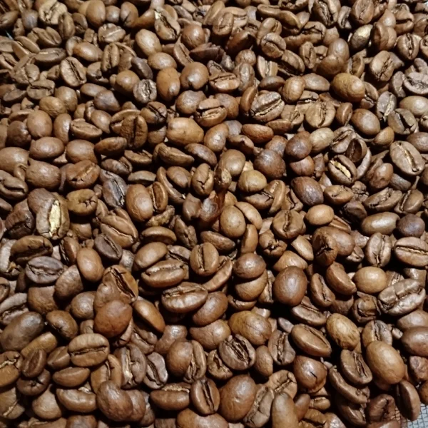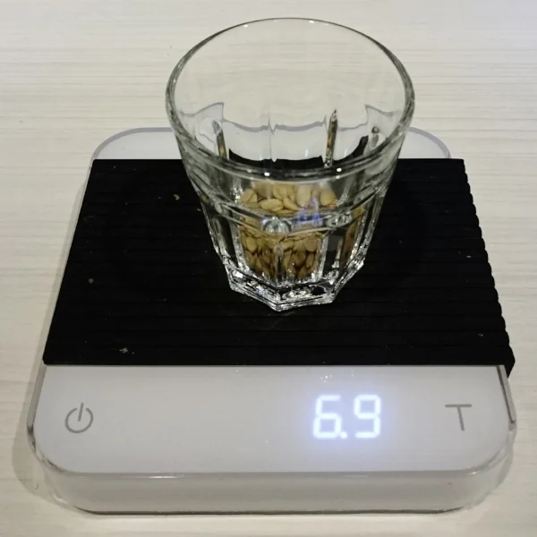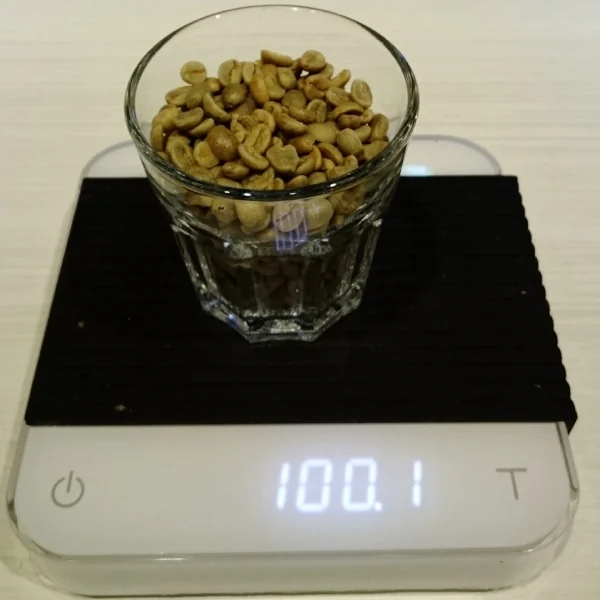 這次的烘焙量500g, 先取100g樣品估算瑕疵比率. 倒出豆子時的發酵香氣撲鼻, 有點像早期發酵味較強的日曬耶加雪菲, 但是甜香氣又更盛了一點. 瑕疵豆總重6.9g, 有不少破碎豆跟貝殼.